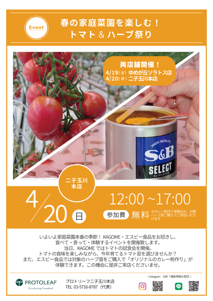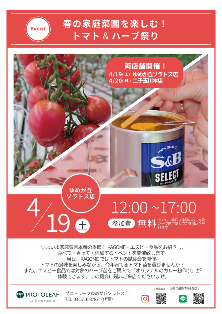 いよいよ家庭菜園本番の季節!KAGOME・エスビー食品をお招きし、食べて・香って・体験するイベントを開催致します。当日、KAGOMEではトマトの試食会を開催。