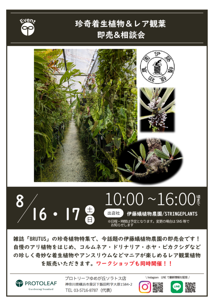 2025年7月12日 / 最終更新日時 : 2025年7月12日 protoleaf_blog イベント 【ゆめが丘】8/16(土)・17(日) 珍奇着生植物&レア観葉 即売&相談会 ◾️開催日 8月16日(土)・8月17日(日) ◾️時間 10:00〜16:00頃まで ◾️販売/園芸相談 伊藤蟻植物農園/STRINGEPLANTS コメントを残す コメントをキャンセルメールアドレスが公開されることはありません。 ※ が付いている欄は必須項目ですコメント ※ 名前 ※ メール ※ サイト 次回のコメントで使用するためブラウザーに自分の名前、メールアドレス、サイトを保存する。