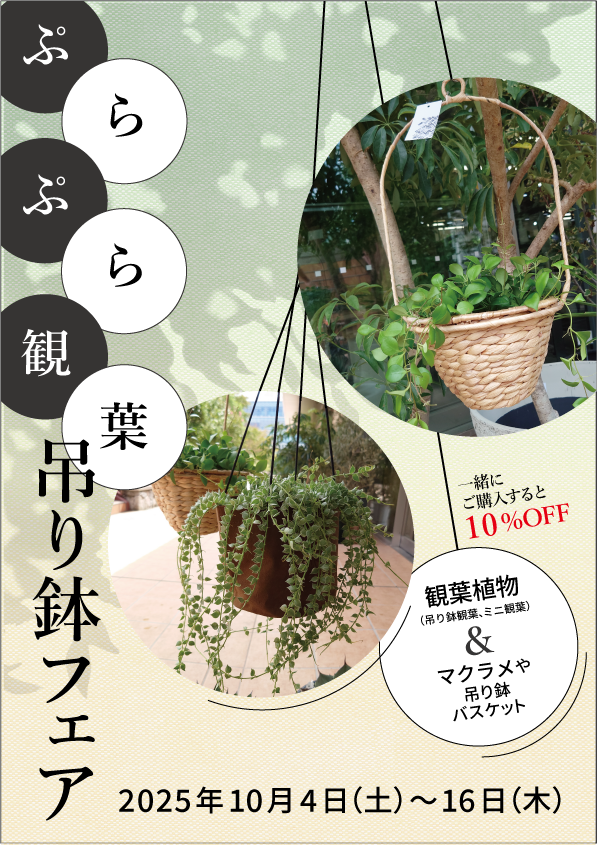 吊り下げのハンギング等と観葉植物セットで購入されるとお得な期間となっております。
