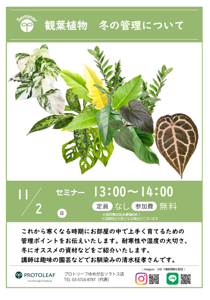 2025年10月24日 / 最終更新日時 : 2025年10月23日 protoleaf_blog セミナー 【ゆめが丘】11/2(日)観葉植物 冬の管理について ◾️開催日 11月2日(日) ◾️時間 13:00〜14:00 ◾️開催場所 プロトリーフゆめが丘ソラトス店 ◾️参加費 無料(予約不要) ◾️講師 プロトリーフスタッフ清水 コメントを残す コメントをキャンセルメールアドレスが公開されることはありません。 ※ が付いている欄は必須項目ですコメント ※ 名前 ※ メール ※ サイト 次回のコメントで使用するためブラウザーに自分の名前、メールアドレス、サイトを保存する。