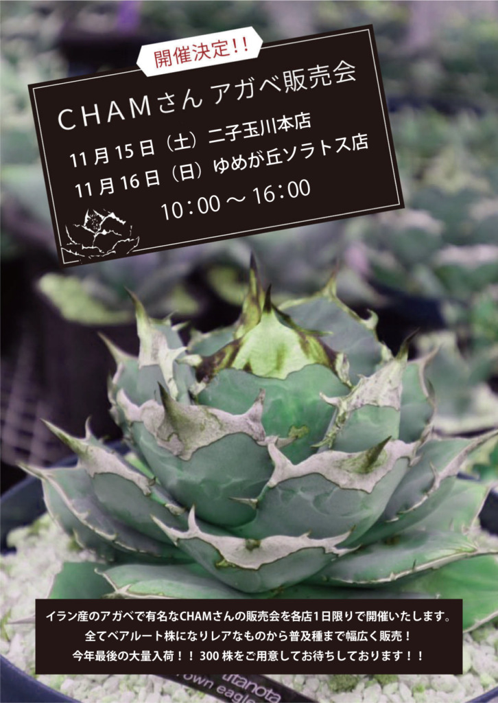 イラン産のアガベで有名なCHAMさんの販売会を各店1日限りで開催いたします。全てベアルート株になりレアなものから普及種まで幅広く販売!今年最後の大量入荷!!300株をご用意してお待ちしております!!