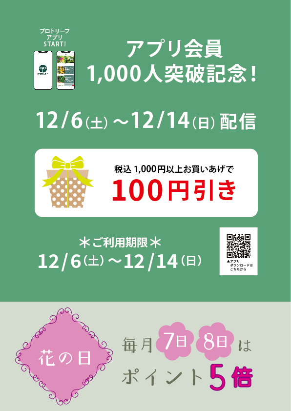 プロトリーフアプリ、登録1000人突破を記念しまして特別アプリクーポンを配信します。